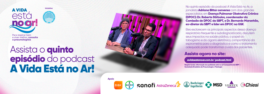A Sociedade Brasileira de Pneumologia e Tisiologia criou a campanha A vida está no ar para chamar a sua atenção para a importância da saúde respiratória e incentivar a busca por um pneumologista sempre que surgir algum problema. O objetivo é empoderar você com informações confiáveis sobre as doenças respiratórias que mais afetam os brasileiros e mais preocupam os especialistas. Então, respire fundo e embarque com a SBPT nessa viagem pelo mundo da respiração.